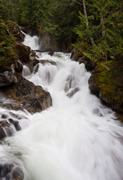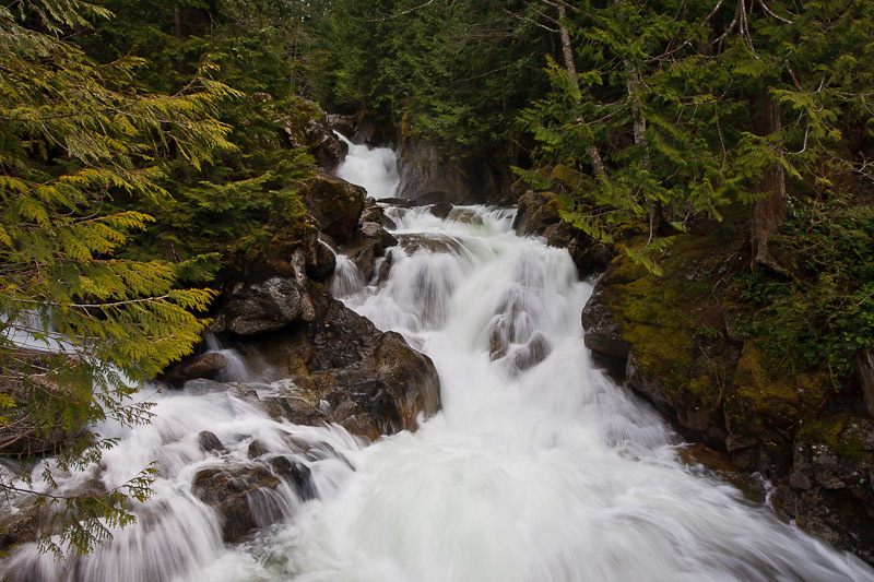 Aside from the fact that the falls are hidden from view until you're driving right past it, Deception Falls isn't really that deceiving. While certainly nowhere near the level of grandeur of some of the other waterfalls in the Alpine Lakes region, Deception Falls is a scenic attraction with easy access that provides a good rest stop for travelers heading over Stevens Pass. The falls consist of a series of cascades which tumble down a narrow gully within a dark forest for a total of about 105 feet. The steepest part of the falls is visible immediately upstream of the highway's bridge over Deception Creek, crashing about 40 feet in two steps. Above that is another hidden 10-12 foot fall. Directly beneath the highway's bridge is the largest part of the falls, a long sliding cascade with a drop of 55 feet total which terminates in a wide plunging drop just below a footbridge.