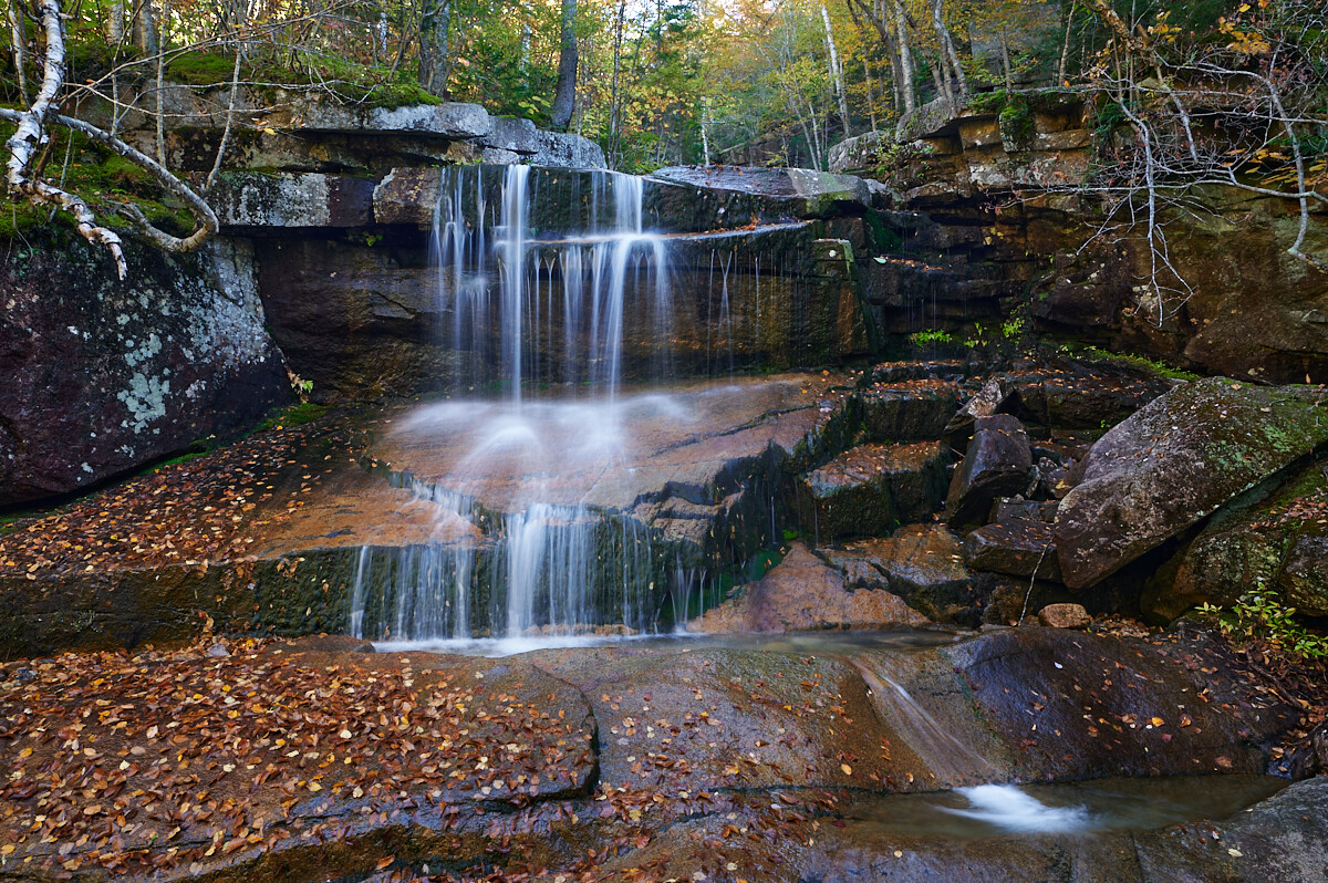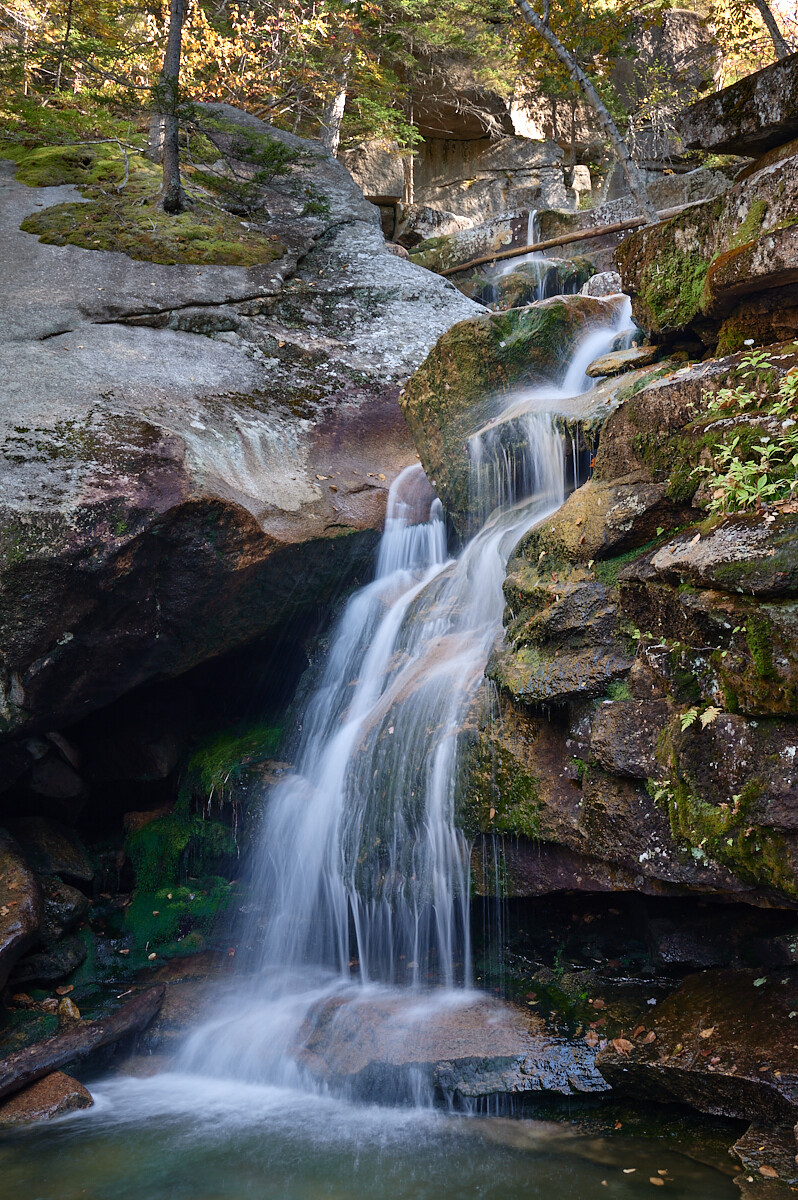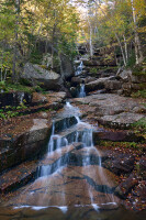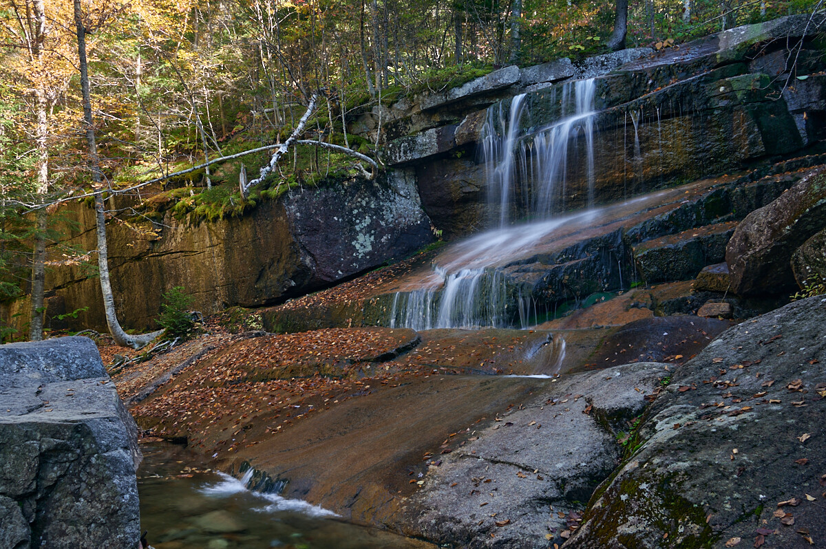 Champney Falls is a surprisingly significant waterfall found just off of the Kancamagus Highway in White Mountain National Forest near Conway. The falls consist of a series of cascades and veils where its namesake stream tumbles down a narrow gully carved in the granite bedrock, dropping a total of 117 feet. At cursory glance it appears that the upper half of the falls may tumble over a series of large boulders wedged in the streambed, but in actuality most of the descent does occur over congruent bedrock. The upper section of the falls tumbles and cascades down a narrow sluice-like formation in several steps for 74 feet. The second distinct drop is a more defined veiling fall of about 20 feet, and then the final drop is a handsome block-shaped ledge where the stream curtains 23 feet over a uniform ledge and impacts a sloping protrusion of bedrock below.
