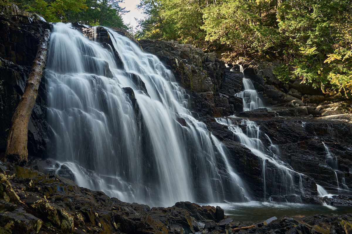 From the town of Bingham, follow ME 16 west from US 201 across the Kennebec River, then turn right onto Pleasant Ridge Road and continue 3.3 miles to the trailhead parking on the right, next to a fenced maintenance yard. The trail to the falls is marked with a white sign attached to a tree, and leads gradually down to the base of the falls in about one quarter of a mile. Use caution on the rocks at the base of the fall, they are exceptionally slippery.