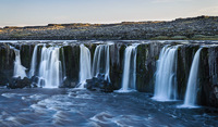 Selfoss is the first waterfall in the Jökulsá á Fjöllum (River) as it begins its descent down the massive Jokulsargljufur. At the falls the river transitions from a broad, desolate volcanic plain to a rugged canyon carved in expansive columnar basalt. The river has carved a narrow notch in the basalt formations to form a long, narrow horseshoe shaped canyon where it plunges 44-feet in a furious roar. Because of the large volume of water involved, the river pours across a huge expanse of the bedrock, causing the crest of the falls to stretch to well over 1,200 feet in length - likely making Selfoss the widest waterfall in Iceland (or if not then certainly among the top 5).