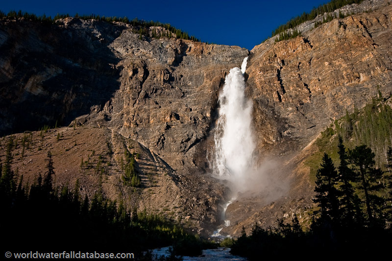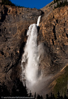 Takakkaw Falls is a moderately high volume waterfall along the unnamed stream flowing from the Daly Glacier in British Columbia's Yoho National Park. The falls drop a total of 992 feet in four distinct steps, first dropping over two narrow plunges hidden within the slot canyon at the top of the falls (neither of which can be seen from the base of the falls). The river then hurtles 853 feet over the side of the Yoho Valley wall, then cascading down a narrow flume-like stairstep for an additional 94 feet. The falls are frequently cited as dropping 1,248 feet (380 meters), but this seems to be a generalized overestimate (based on what, we are not certain). Some sources list a height of 1,650 feet as well, but this refers to the total change in elevation between the lake below the Daly Glacier and the Yoho River. It should be noted that our measurements of this waterfall were derived using both a laser and a GPS, and have a slightly wider margin of error than with a laser alone - perhaps as much as +/- 40-50 feet.