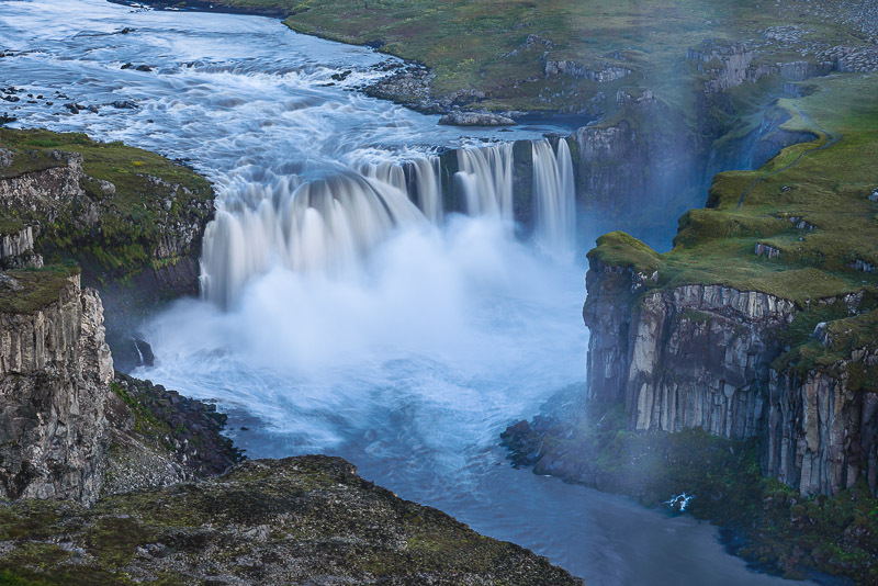 Hafragilsfoss is the second largest waterfall in the Jökulsá á Fjöllum (River) after its upstream sibling Dettifoss, and are among the largest in Iceland. Situated on the third step of the Jokulsargljufur, the immense canyon which harbors the largest waterfalls along the river, the river plunges 89-feet over a 280-foot wide ledge formed in the volcanic bedrock, with good examples of columnar jointing visible in the cliffs on either side of the falls. As the river sources in several huge lobes of the massive Vatnajökull, and flows through areas of active volcanism, there is almost always a high volume of silt in the water. This causes the river to assume a color ranging from slightly gray to straight up chocolate milk during the warmest summer months.