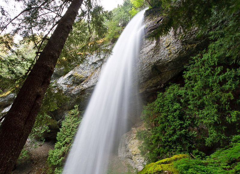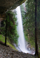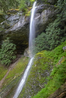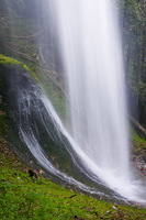 Cathedral Falls is a lofty plunging waterfall along an unnamed tributary of Goat Creek in an isolated corner of Mount St. Helens National Volcanic Monument. The falls launch 248 feet over a massive overhang then veils across a strange cone-shaped protrusion of bedrock that forces the water to veil down in a subtle swooshing shape. The formation of the cone at the base of the falls is rather puzzling, as it doesn't appear to be the result of minerals accumulating from the falling water. More likely the falls have simply pounded down onto a much more rugged outcrop of rock that was disconnected from the now overhanging cliffs above, and have slowly worn it into a rounded shape over time. The alcove which gives the falls its very fitting name is actually so tall and deep that there are a couple full sized Western Red Cedar trees growing underneath the overhanging cliff. The drainage area of the stream which forms the falls is not significant in any sense, and in turn the falls will lose much of its power by the end of June - sometimes earlier in the year - but seems to retain at least a trickle of water throughout the year. At the peak of runoff season a considerable volume of water can pour over the cliff, elevating the falls to very impressive stature.