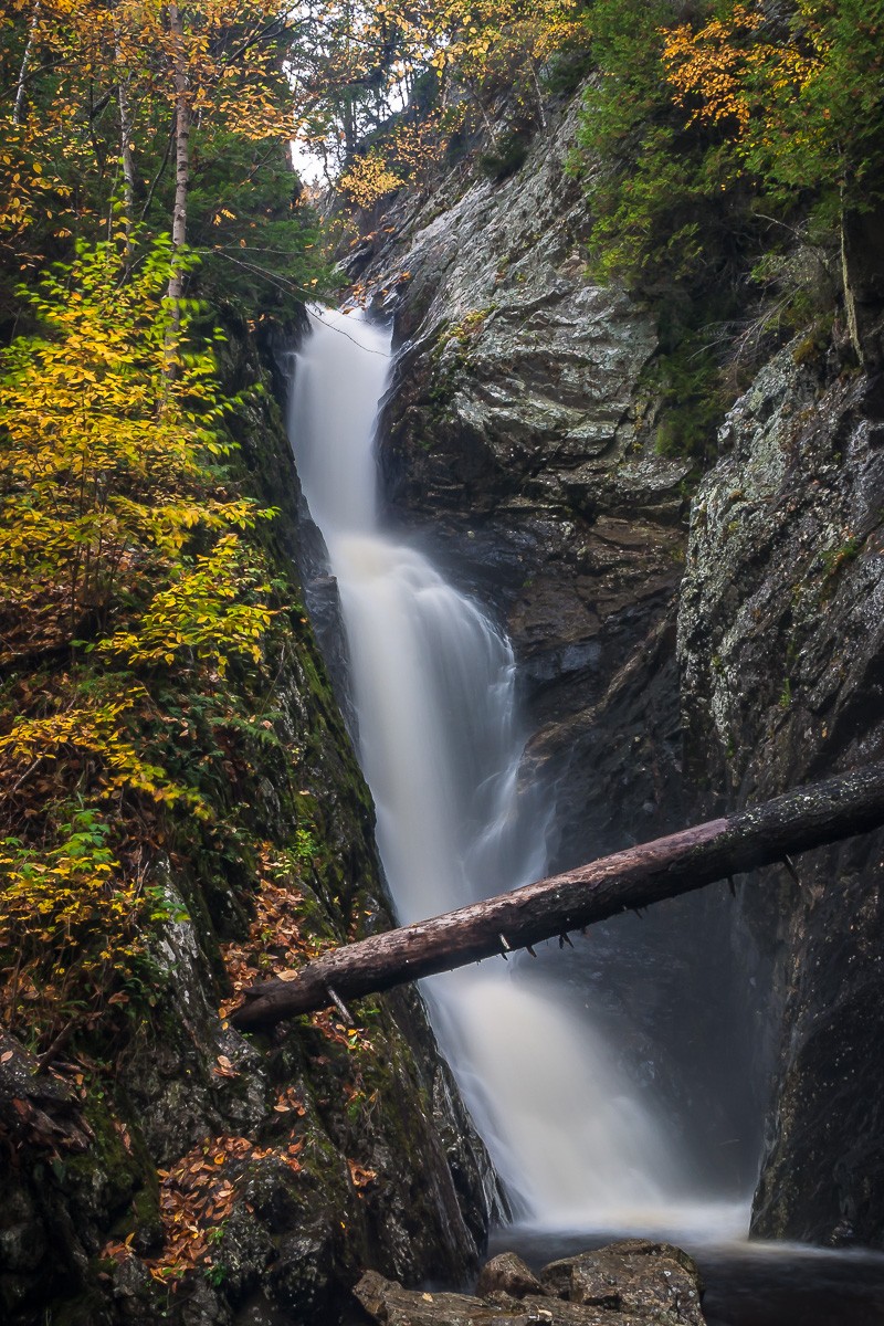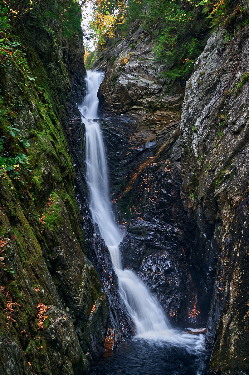 Dunn Falls is one of Maine’s most noteworthy waterfalls both in terms of height and its impressive geology. At the falls the fledgling West Branch of the Ellis River is squeezed through a narrow notch which opens into an impressive canyon, its cliffs flanking either side of the river for 150 vertical feet. The falls plunge in four quick leaps for a total of 104 feet, terminating in a narrow pool set within the flume-like gorge below the falls. The uppermost tier is set back such that it can only be seen in isolation, whereas the final three leaps are visible collectively from the base of the falls.