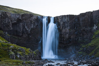 Gufufoss is one of literally dozens of waterfalls found along the Fjarðará as it cascades down to join the ocean at the head of Seyðisfjörður. During the spring melt season the stream spreads across a uniform basalt ledge and plunges 88-feet in a broad curtain of water, sending a large volume of spray into the air. Later in the season the falls narrow by perhaps two-thirds and become a more characteristic plunge type waterfall.